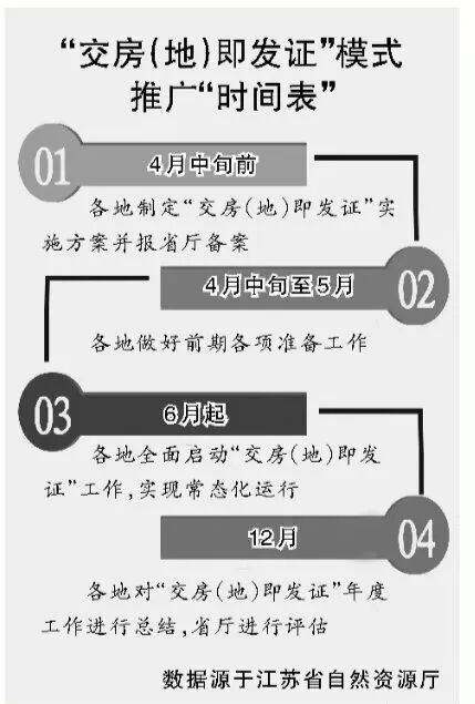 买过房的人都知道,房产证至少要在交房之后半年到一年才能拿到,可能会耽误孩子上学或房屋买卖进度,不能及时拿到房产证,对于花了毕生积蓄的购房者来说非常不踏实。3月22日,江苏省人民政府官网发布消息,江苏省自然资源厅与国家税务总局江苏省税务局19日联合印发了《关于在全省推广“交房(地)即发证”不动产登记模式提升服务质量的通知》(以下简称“通知”),将在全省推广“交房(地)即发证”的不动产登记模式。据了解,江苏也是目前在全国范围内唯一整省推广“交房(地)即发证”不动产登记模式的省份。“交房(地)即发证”是指:新建商品房等项目组织交房时,在相关准备工作完成的前提下,不动产登记机构与税务、金融机构等部门联动,在交房现场为提出申请的购房人办理不动产登记、颁发不动产权证书,实现购房人收房同时即可领取产权证书。《通知》明确了在全省推广“交房(地)即发证”不动产登记模式的“时间表”和“路线图”。全省推广“交房(地)即发证”分为“四步走”: