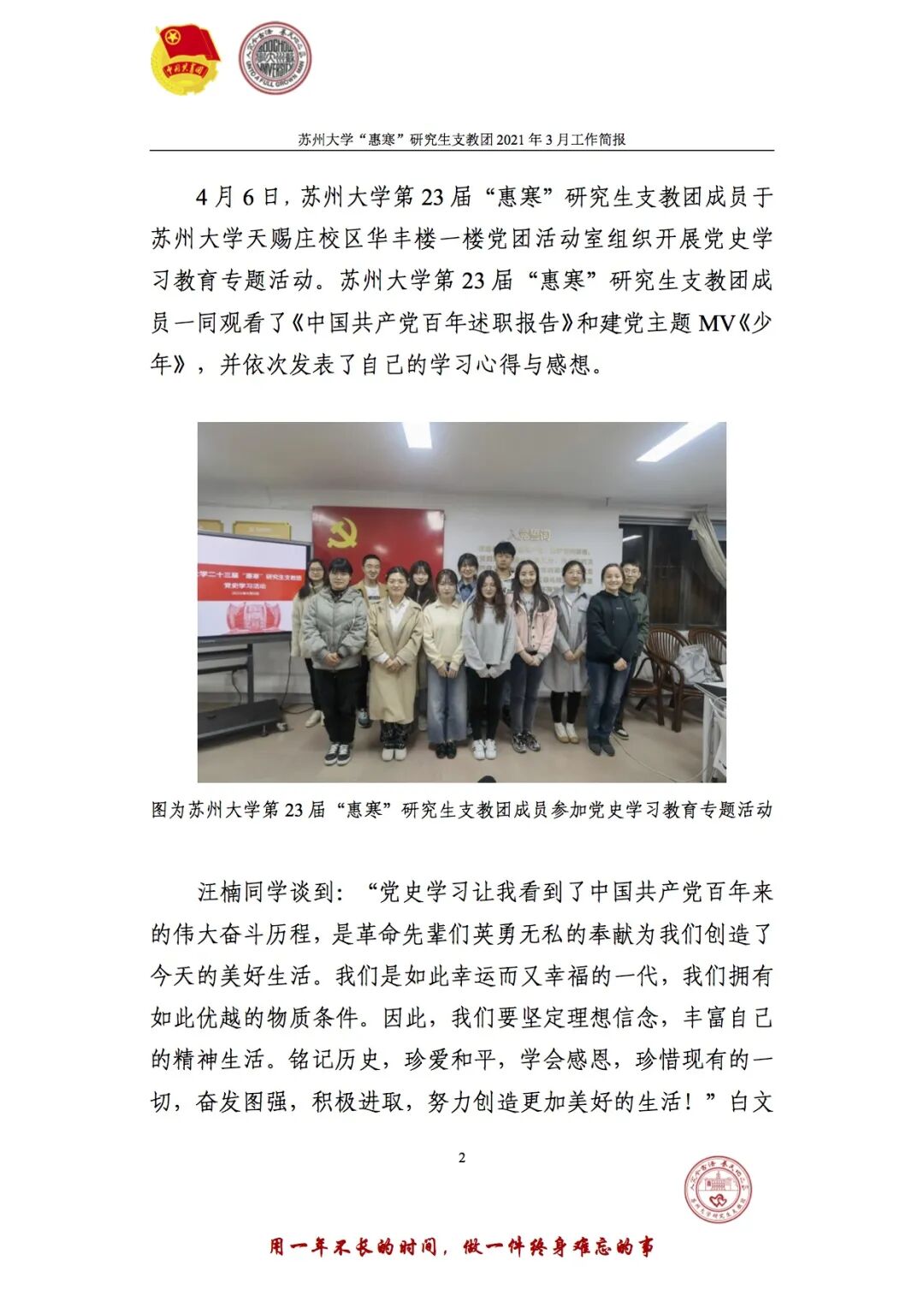 About Feature 苏州大学共青团围绕立德树人根本任务,以“思想引领”“组织建设”“成长服务”“校园文化”四大工程为抓手,持续提升引领力、组织力、服务力和大局贡献度,团结带领全校各级团组织和团员青年为学校高质量发展和“双一流”建设做出新的更大贡献。