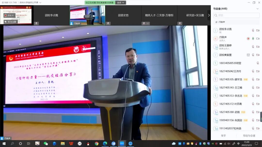 3月23日下午,由苏州大学团委主办、计算机科学与技术学院团委承办的苏州大学“大学生青年马克思主义者培养工程”精英人才计划开班仪式暨“青马公开课”校级示范课在本部理工楼214室与WeLink客户端线上线下同步举行。苏州大学附属第一医院李锐教授担任主讲人,计算机科学与技术学院党委副书记李恩秀,校团委副书记徐娜,计算机科学与技术学院学工办主任高珊,计算机科学与技术学院团委书记邝泉声等出席本次活动,2022年苏州大学“大学生青年马克思主义者培养工程”精英人才计划全体学员、苏州大学第24届“惠寒”研究生支教团成员及计算机科学与技术学院学生骨干参与本次活动。