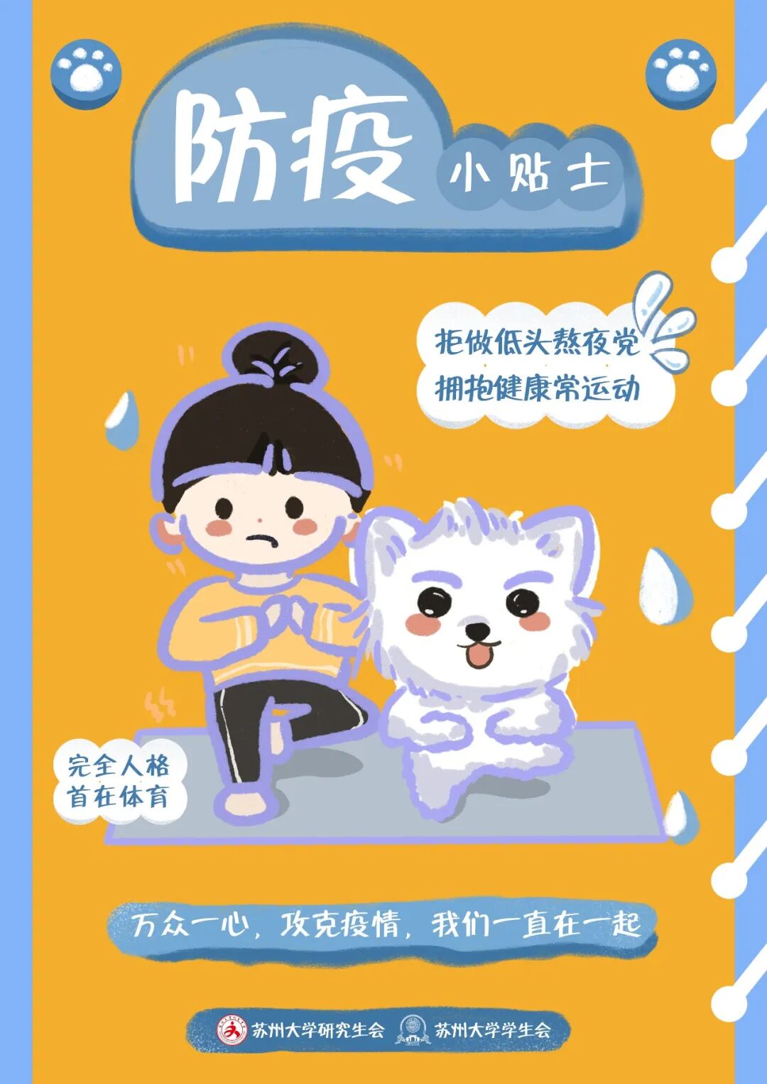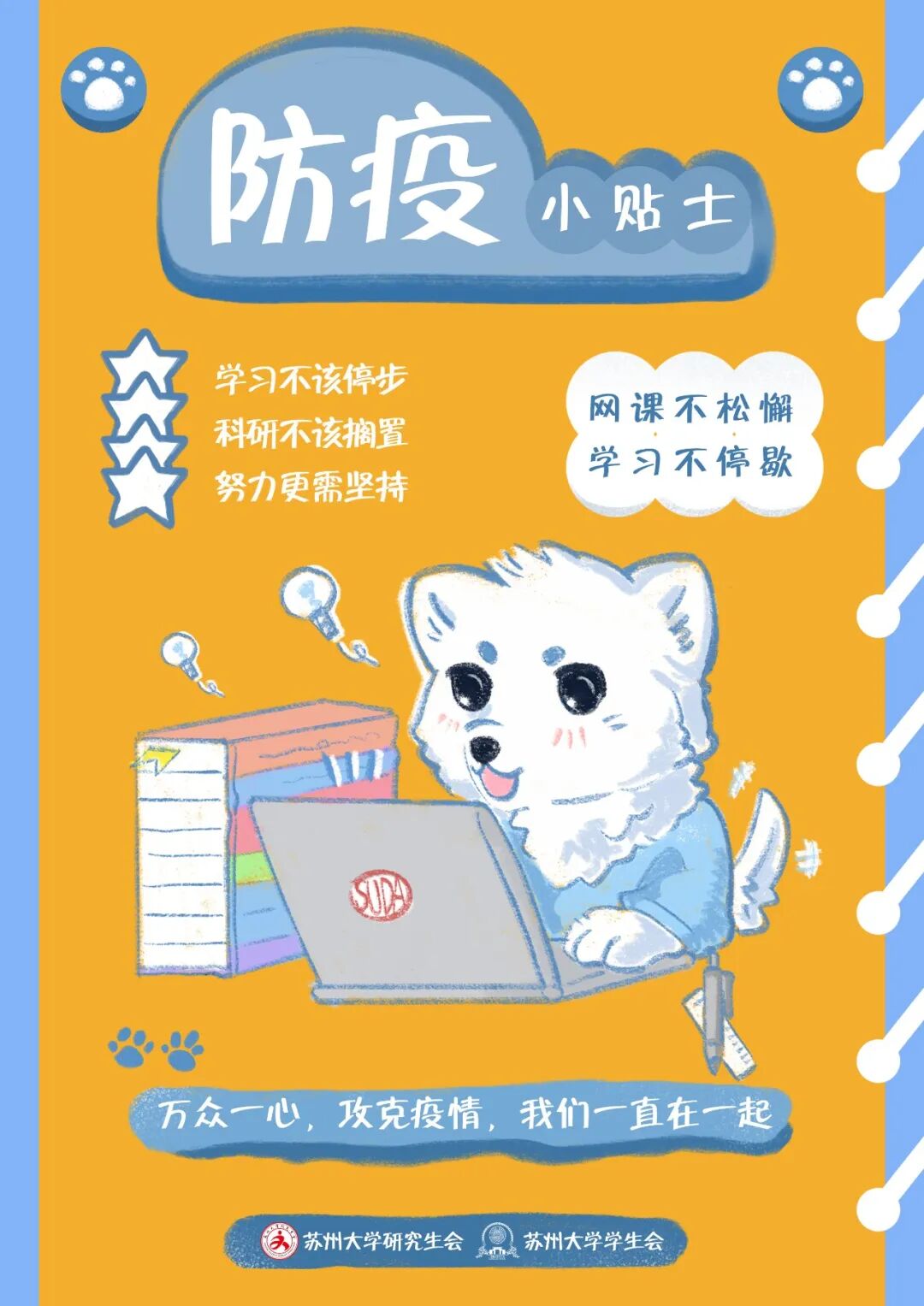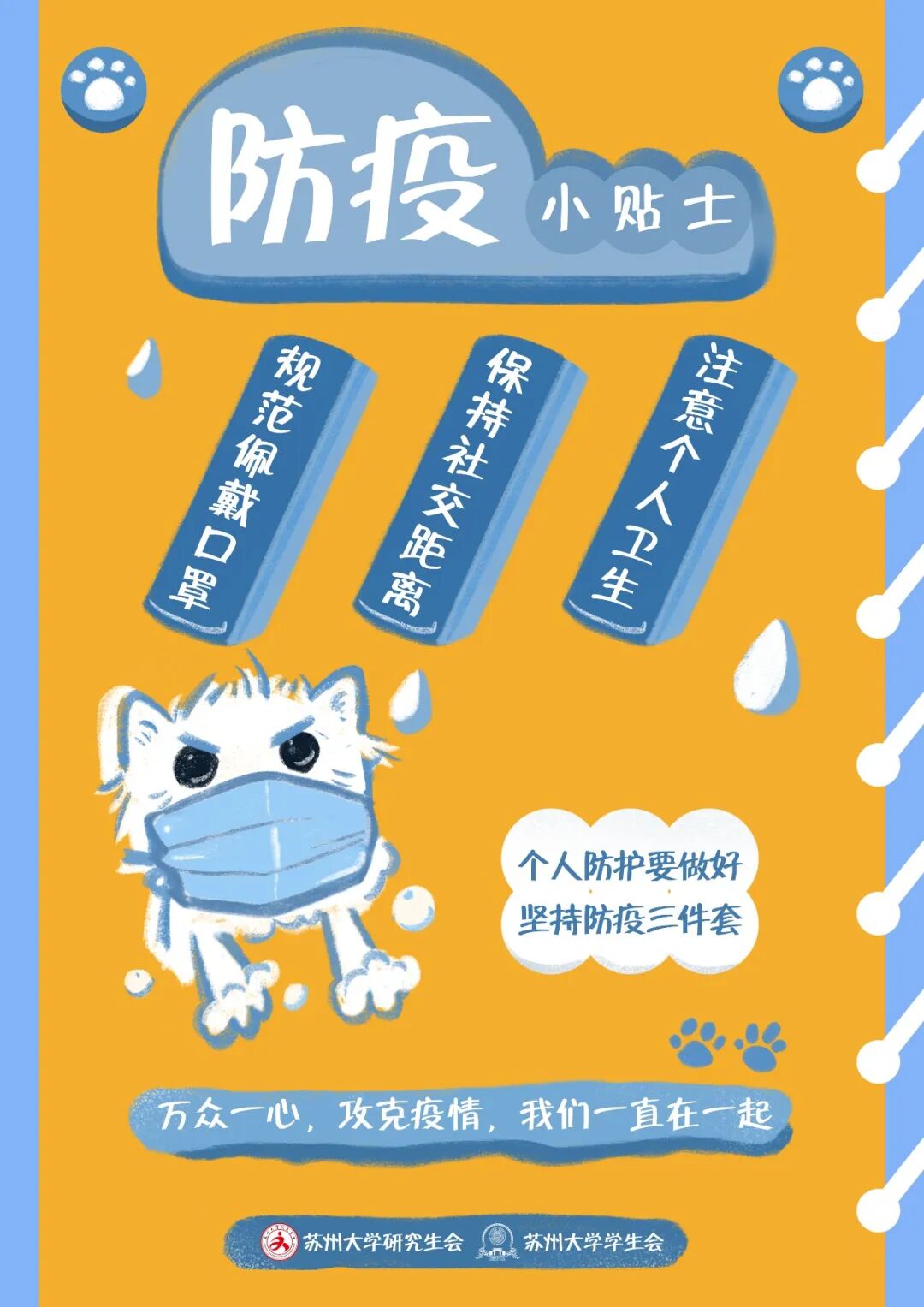 亲爱的同学们,让我们一起坚持“防疫三件套”:规范佩戴口罩、保持社交距离、注意个人卫生;牢记“防护六还要”,口罩还要戴、社交距离还要留、咳嗽喷嚏还要遮、双手还要经常洗、窗户还要尽量开、新冠疫苗还要种;让我们一起尽量减少外卖和网上购物,降低接触风险,确需接受快递和物品时,要准备好一次性手套和消毒湿巾,尽量减少与外包装的接触,保护好“革命的本钱”。因疫情而留校的同学们,让我们一起努力将“非必要不出校”成为我们的行动自觉,减少跨校区流动,为疫情防控贡献自己的力量。