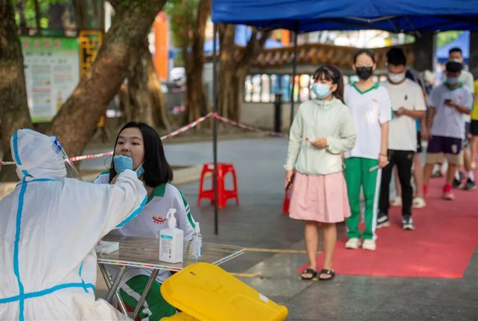 Students line up for nucleic acid test in southern Hainan Province.