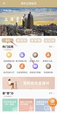 进入“随申办”普陀区旗舰店后,可以在“首页”中的“热门应用”栏目,或者在“靠普服”栏目的“健康医疗”菜单中找到“就医电子票据”服务。