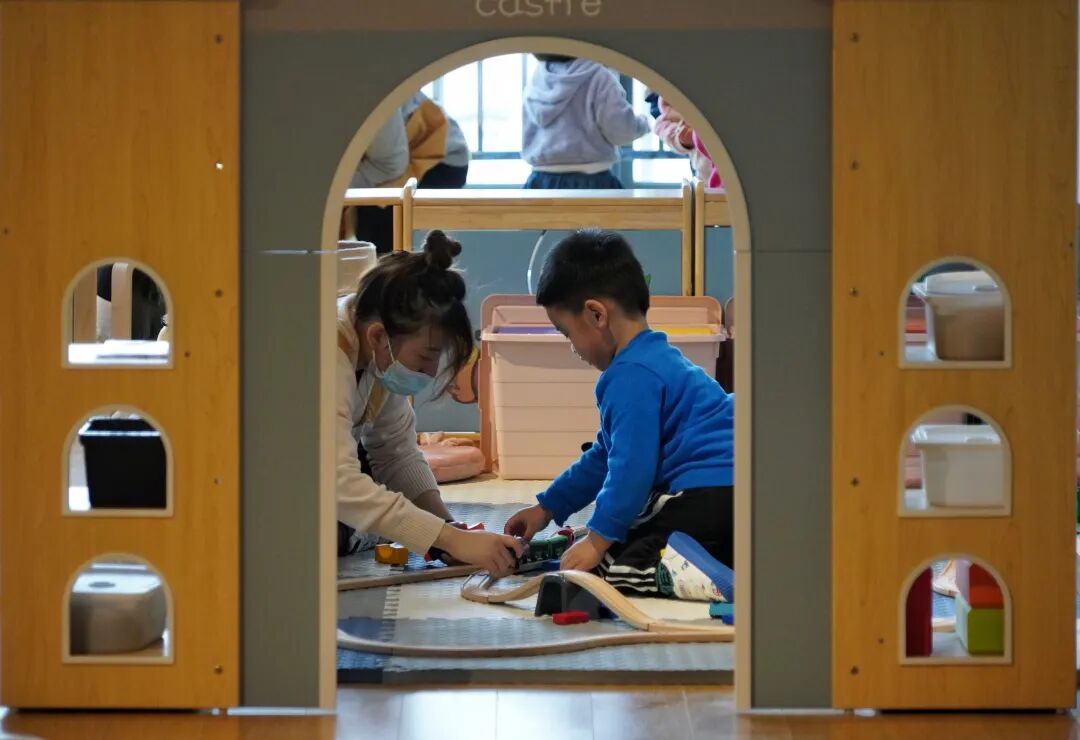 作为普陀区首个落地运营的“宝宝屋”之一,位于曹杨-武宁党群服务中心二楼的社区“宝宝屋”以“整合发展、均衡发展”的教养理念为建设宗旨,整体空间宽敞,色彩明亮,仿佛置身于一所幼儿园。整个活动区域铺设有软垫,滑滑梯、“小城堡”“小餐厅”等游戏设施一应俱全。记者在现场看到,孩子们在完成了检查、洗手等一系列健康防护措施后,就由家长交到托管老师手中。孩子们在老师的带领下玩起过家家、滑滑梯等游戏。“‘宝宝屋’设有舒适生活和综合游戏两大区域,为1-3岁的婴幼儿提供游戏玩具及材料,以‘适宜性、层次性、多样性以及生态化’为原则,为社区幼儿及其家长提供一年12次的免费公益托育服务。”“宝宝屋”负责人周女士向记者表示。