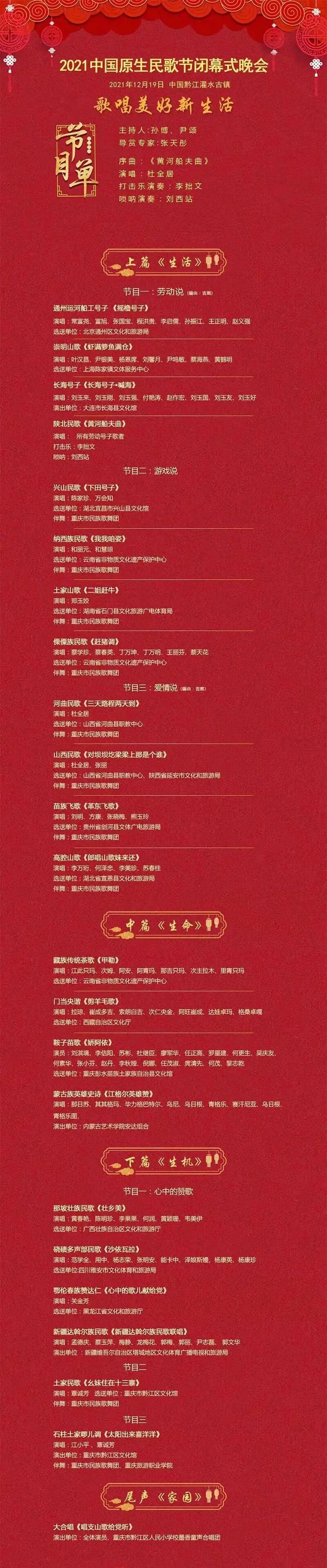 闭幕式原生民歌展演以 “生活·生命·生机”为主线,包含序、上篇《生活》、中篇《生命》、下篇《生机》、尾篇《家园》五个篇章。