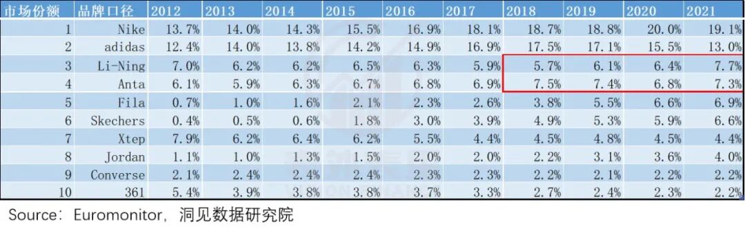 这表现在市场数据上就是,相比2018年,安踏2021的市场占有度下降了0.2%,而李宁则上涨2%。