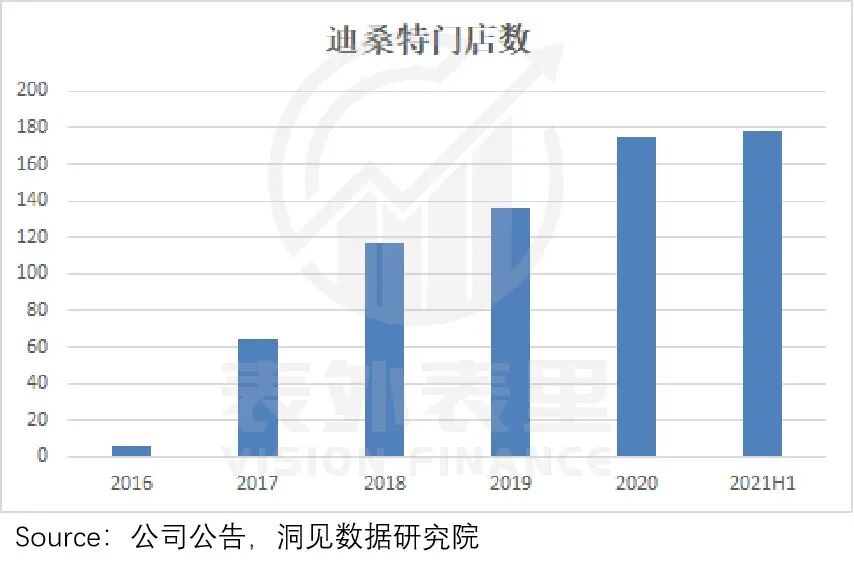 比如,定位高端滑雪运动的迪桑特,延续FILA的直营模式,2017-2021H1,门店数量从64扩展到178家。