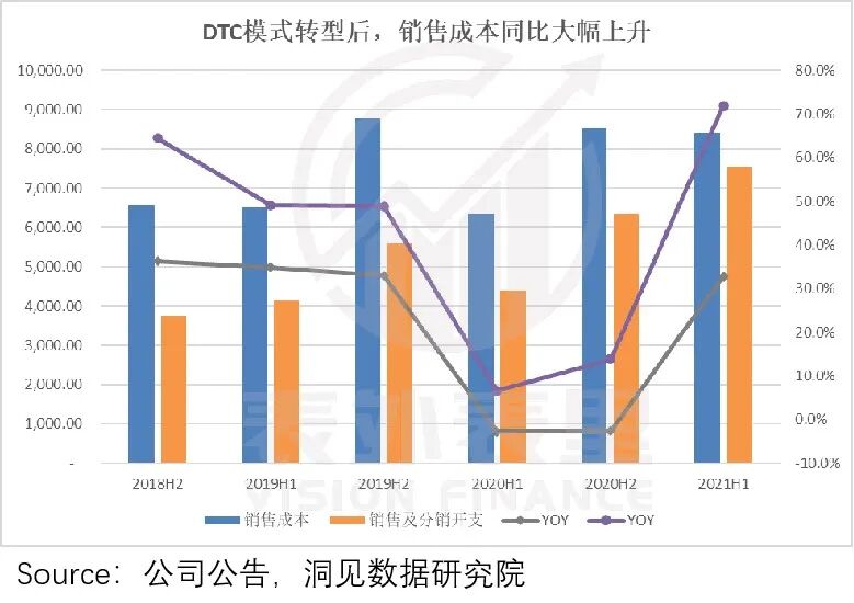 安踏目前也是类似,2021H1进行DTC转型后,销售成本明显上升。