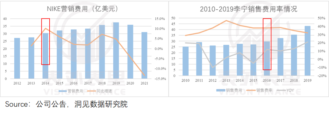 比如,耐克、李宁在2014、2015年DTC转型阶段,销售费用同比当季,均出现迅速提升。