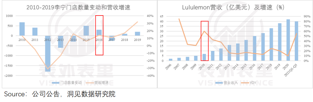 比如,Lululemon和李宁分别在2009年和2015年,进行过DTC转型,其收入也像安踏一样,在下一年度大幅增长。