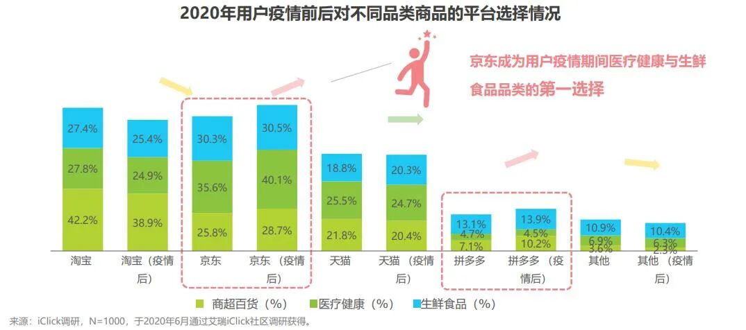 但与之相反,据艾瑞咨询,疫情后通过京东、拼多多等,购买商超百货品类的用户,依然有较高增长。