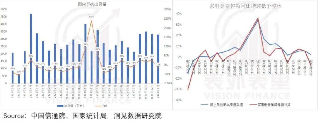 而3C业务的另一贡献大头整体家电品类,也有同样的表现:零售额增速2020年开始低于限上零售额整体增速,到2021年12月,同比增速甚至转负。