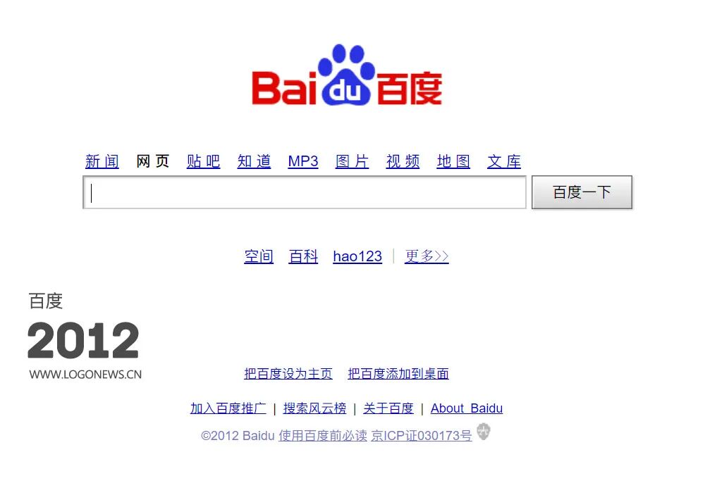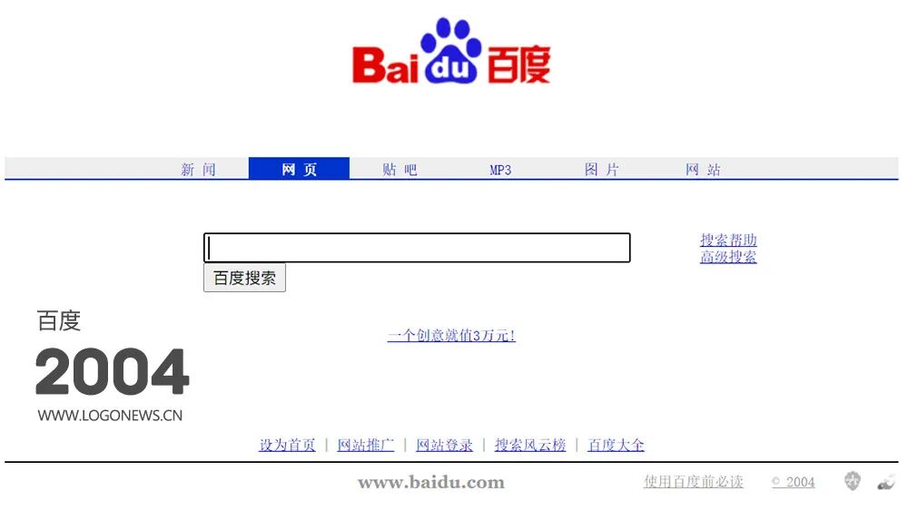 2004年,百度将LOGO从搜索框的左侧移到了上方居中位置,LOGO下方的快捷菜单栏新增了更多内容。
