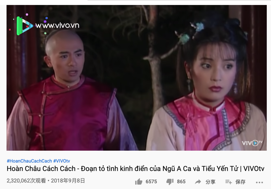 因为越南早年引进的中国电视剧大多都是这样处理,所以实质上,那些让越南观众魂牵梦萦、津津乐道的童年回忆,一张嘴都是同一个声音,魅力大打折扣,就这,大家也都习惯了。直到今天,Youtube 上随手拎出一个国产电视剧怀旧视频,在越南也有 200 万的点击量。