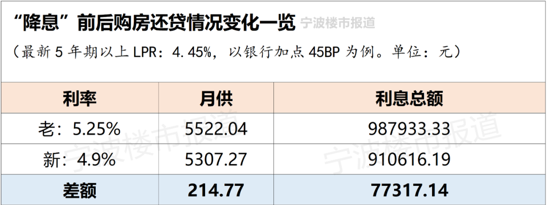 如果你是改善型购房者,按宁波房价水平算,买的是总价五六百万元的房子,按揭300万元,那月供可以少还1800余元、30年利息总额可以减少65万余元!