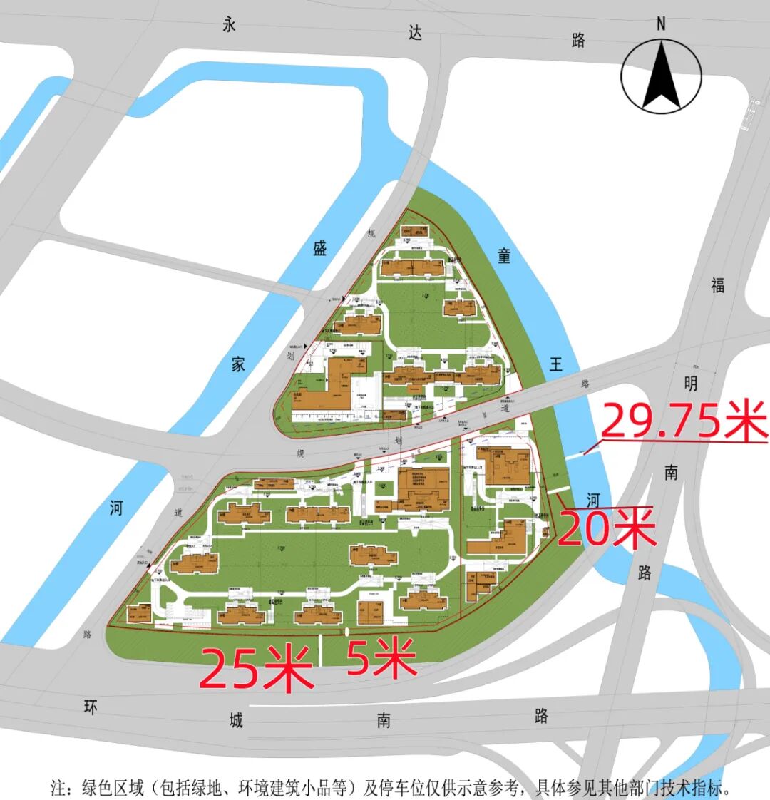 注释:最南面一排商品住宅距用地红线5米、用地红线距环城南路高架25米;项目东面的童王河宽29.75米、河边绿化带宽20米。