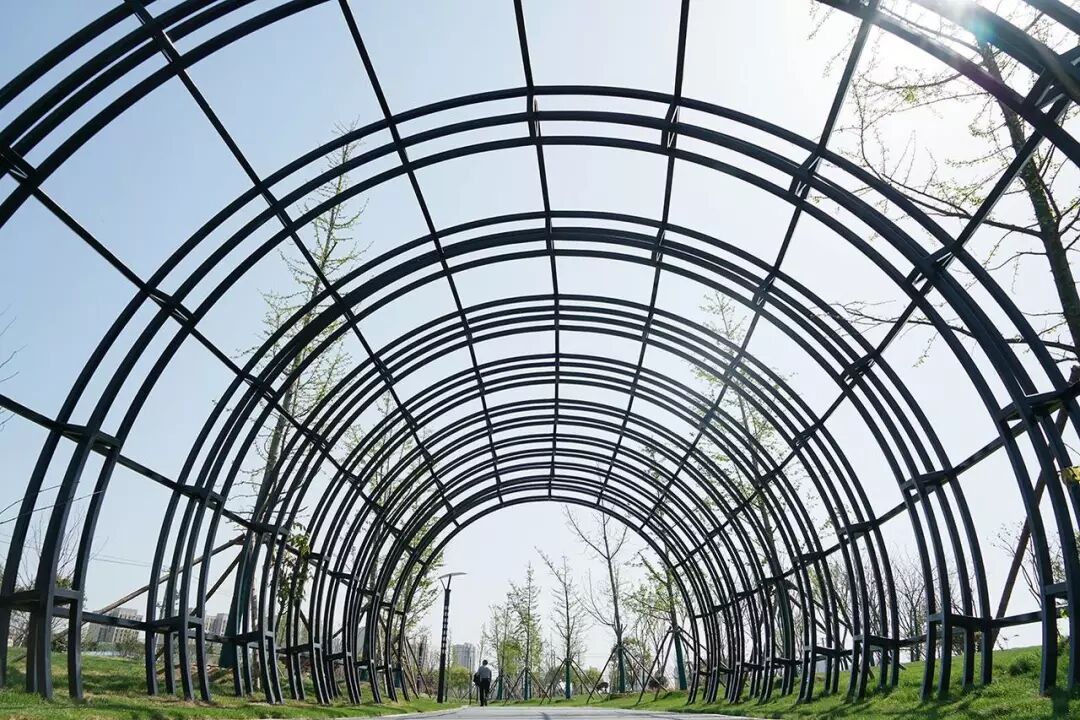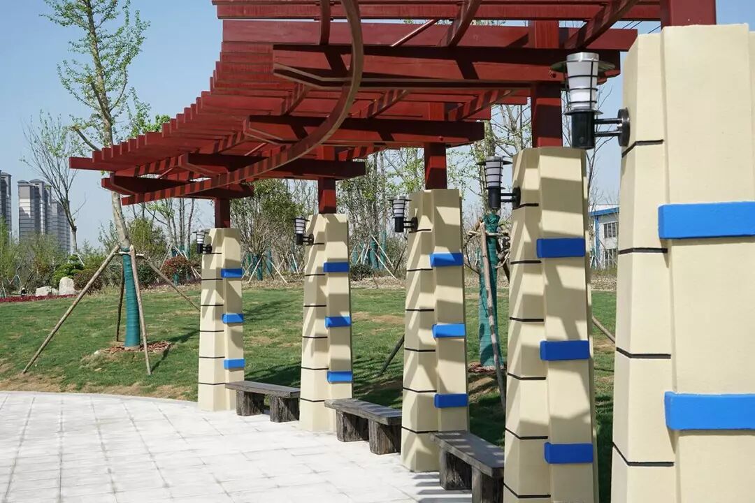 公园利用中式枯山水结合造景树点缀,形成精致中式园林景观。同时以沥青的4m漫步道贯穿整个东西景观绿带,并设置紫藤廊架、铁艺花架等节点作为停留空间,为居民提供休闲观赏场所。