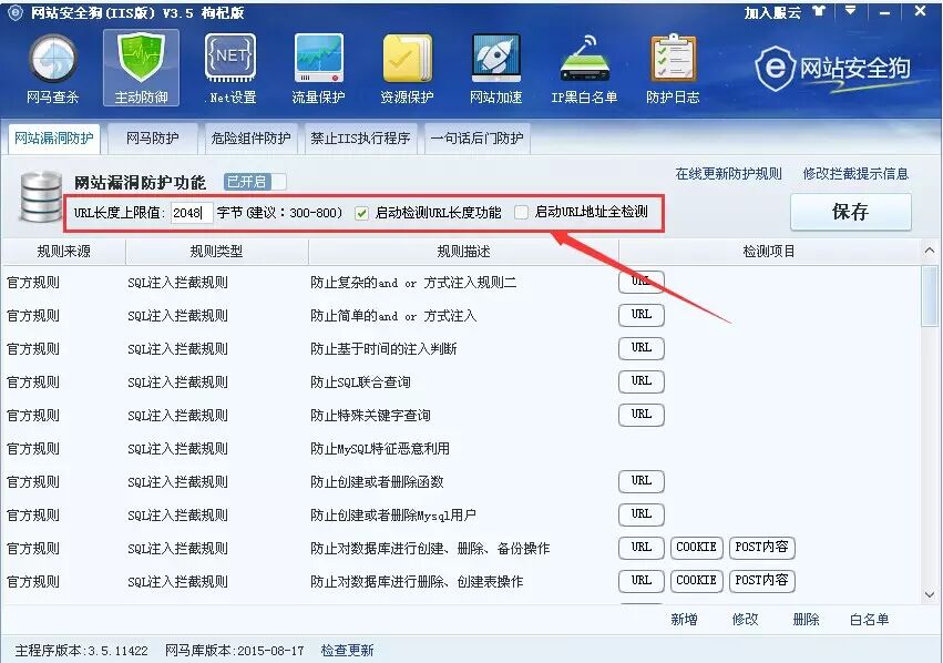1、网站安全狗SQL注入防护功能,可以对URL长度进行设置并且将这个上限值设为通用指标来检测URL长度,当然用户可根据情况自己设定上限值(设置完后记得保存哦)。