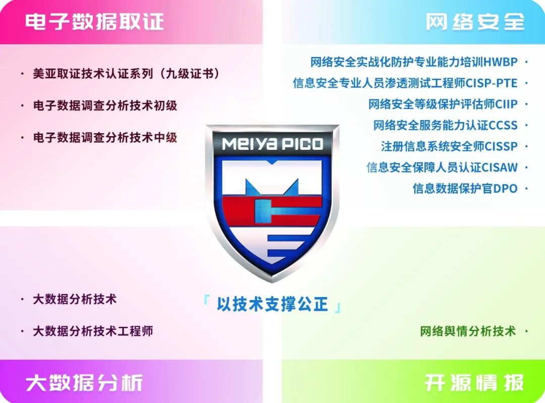About Feature 国内电子数据取证领域龙头企业、网络空间安全专家,主要服务于国内各级司法机关以及行政执法部门。公司主营电子数据取证、网络空间安全、大数据信息化产品、专项执法装备等产品,先后被认定为“国家规划布局内重点软件企业”、“国家创新型试点企业”。