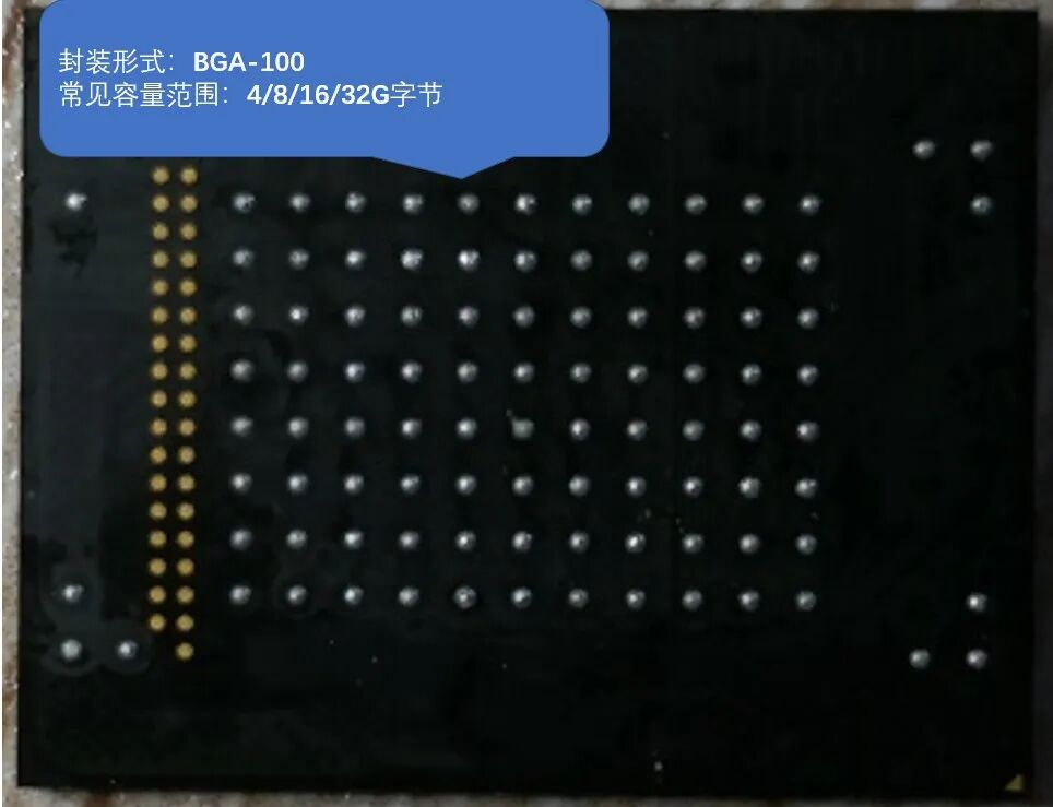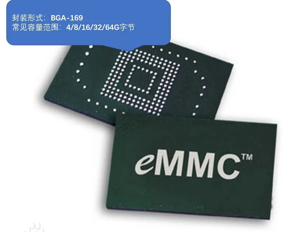 eMMC (Embedded Multi Media Card): 主要针对内嵌式存储器标准规格。eMMC在封装中集成了一个控制器和闪存(FLASH),控制器提供标准接口(SDIO)对外通信并对内管理闪存(FLASH)。其常见容量为:4~64G字节,常见封装(如图7所示)为:BGA-100/BGA-153/BGA-169,一般用于存储嵌入式操作系统、应用信息、日志信息、配置信息、事件信息等。当前eMMC主要应用于智能电视盒、智能手表、T-BOX(车载终端)、汽车导航等设备中。
