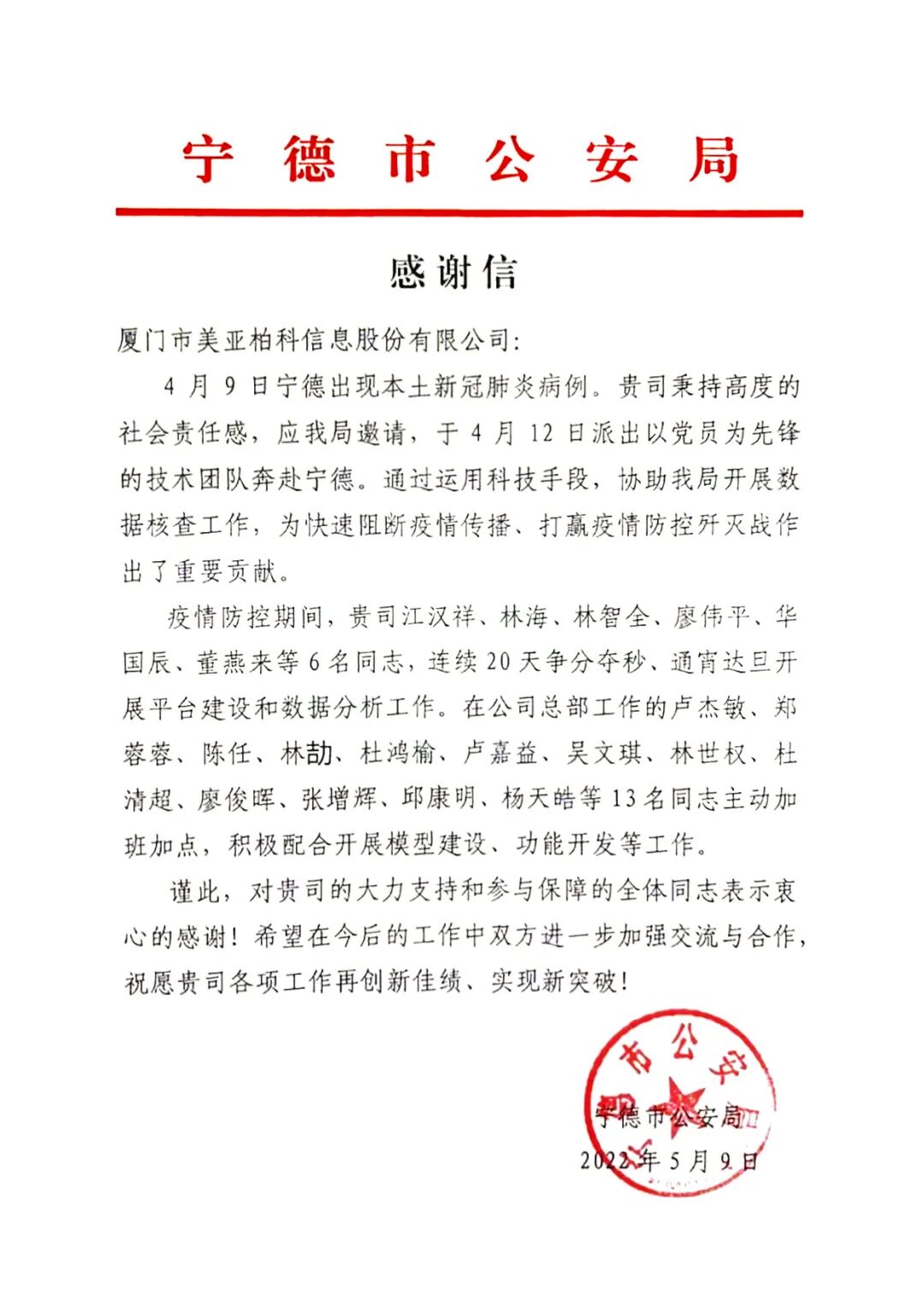 在江汉祥的带领下,党员先锋队同客户密切配合,借鉴泉州、厦门、莆田等地的战“疫”经验,结合宁德实际情况和相关数据资源,一起探讨并设计优化更为科学、精准的在宁动态人口计算模型、应检未检模型,完善“一人一档”核心功能,每份文档生成时间缩短至一分钟,同时辅助一线部门开展流调工作,为快速阻断疫情传播争得先机,赢得主动,得到了客户的高度评价,并收获了客户感谢信: