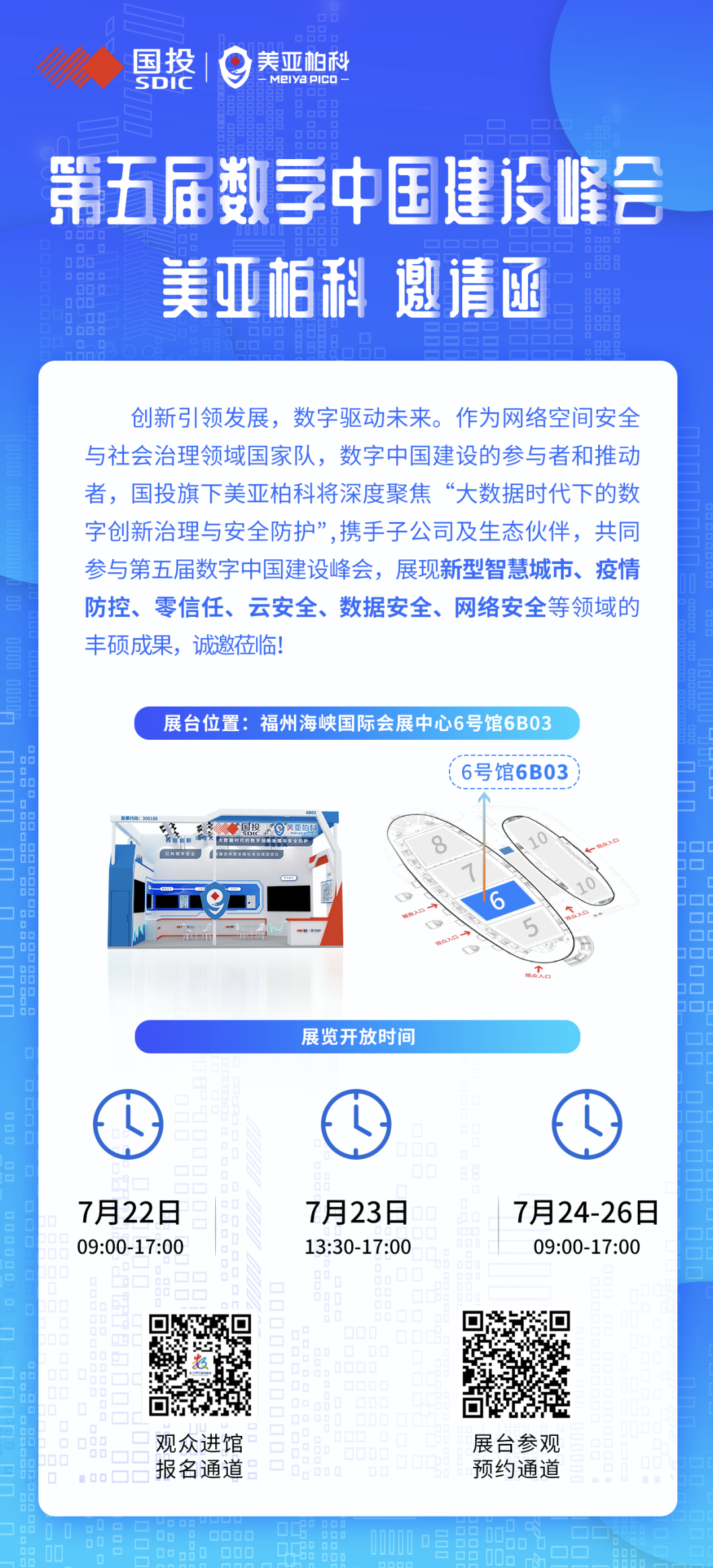 国投旗下美亚柏科作为网络空间安全与社会治理领域国家队,将以“大数据时代的数字创新治理与安全防护”为主题,携手子公司及生态伙伴在6号馆6B03展位展示智慧城市、疫情防控、零信任、云安全、数据安全、网络安全等领域的相关产品及解决方案,同时还将参与8号馆数字福建馆及“数字中国建设成就巡礼”专题展相关内容展示。