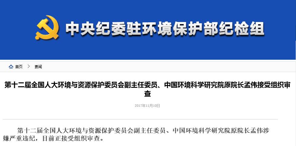 据中央纪委驻环境保护部纪检组最新消息:第十二届全国人大环境与资源保护委员会副主任委员、中国环境科学研究院原院长孟伟涉嫌严重违纪,目前正接受组织审查。
