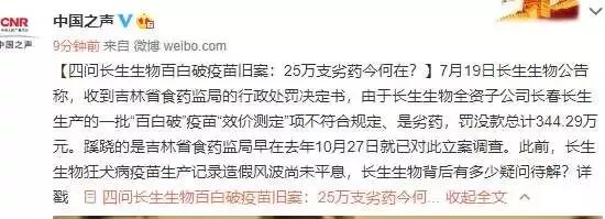 据中国之声《新闻纵横》报道,长生生物狂犬病疫苗生产记录造假风波尚未平息,7月19日一波又起,或者说是沉渣泛起——长生生物公告说,他们收到了吉林省食药监局的行政处罚决定书,原因是长生生物全资子公司长春长生生产的一批“百白破”疫苗“效价测定”项不符合规定、是劣药,罚没款总计344.29万元。