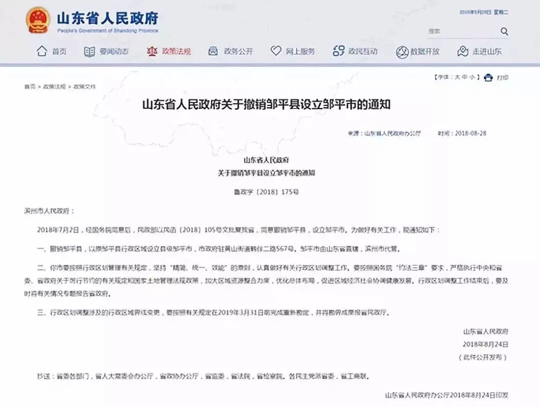 二是山东省政府在今天通过官网发布《关于撤销邹平县设立邹平市的通知》。