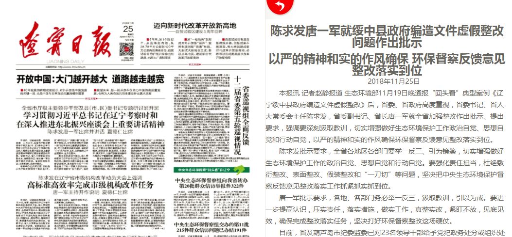 生态环境部11月19日晚通报“回头看”典型案例《辽宁绥中县政府编造文件虚假整改》后,辽宁省委、省政府高度重视,辽宁省委书记、省人大常委会主任陈求发,辽宁省委副书记、省长唐一军就全省加强整改作出批示、提出要求。