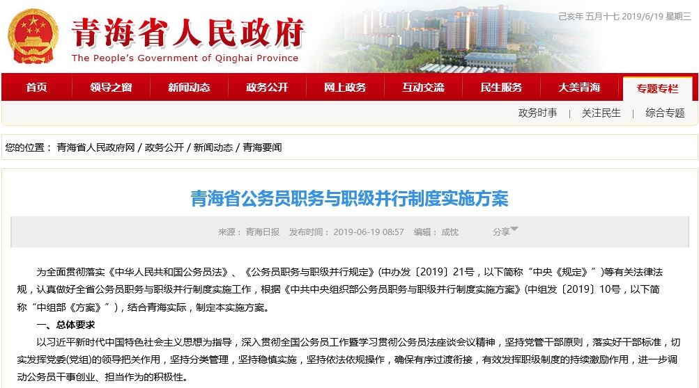 为全面贯彻落实《中华人民共和国公务员法》、《公务员职务与职级并行规定》(中办发〔2019〕21号,以下简称“中央《规定》”)等有关法律法规,认真做好全省公务员职务与职级并行制度实施工作,根据《中共中央组织部公务员职务与职级并行制度实施方案》(中组发〔2019〕10号,以下简称“中组部《方案》”),结合青海实际,制定本实施方案。