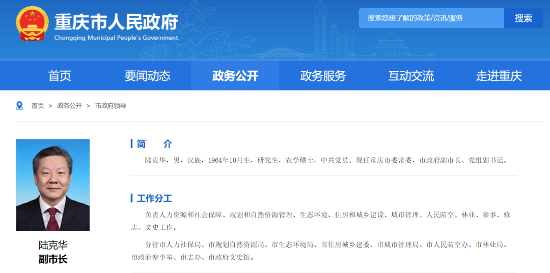 新任重庆市委常委、副市长陆克华已任市政府党组副书记