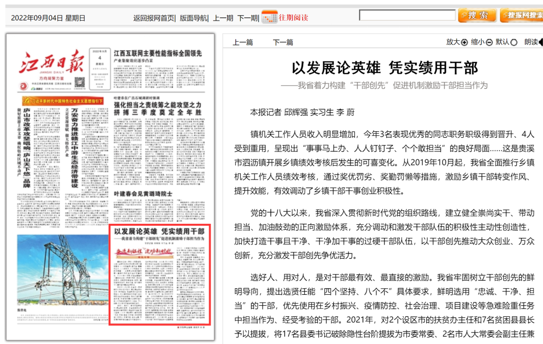 近日,《江西日报》发文《以发展论英雄 凭实绩用干部》,介绍江西省着力构建“干部创先”促进机制激励干部担当作为的做法与成效。