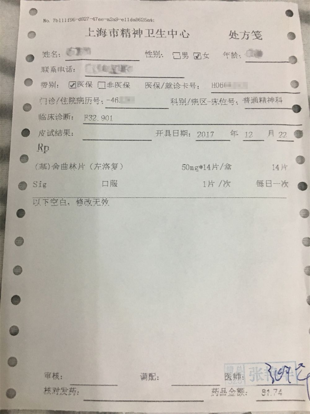 爆料人同时提供了一份上海精神卫生中心出具的处方笺,内容提及为当事人正在接受精神抑郁症治疗。属于科别为“普通精神科”,而临床诊断为“F32.901”,在精神病病种疾病名称中为“精神抑郁症”类别。