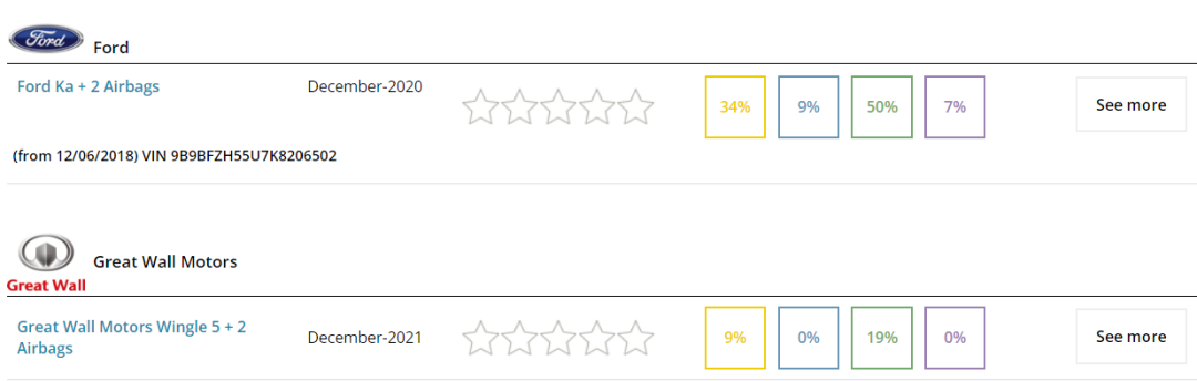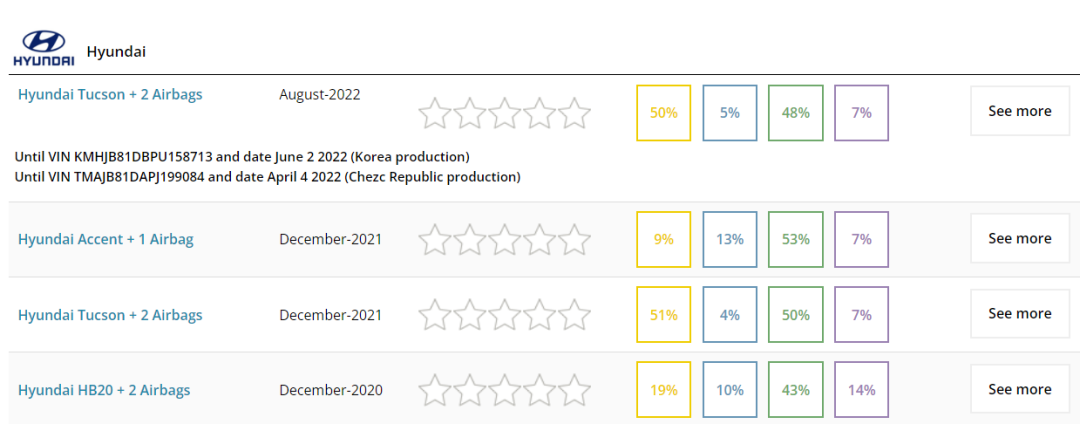 值得注意的是,在拉丁NCAP中获得零星安全评级的不单单只有江淮E10X一个。据汽车行业关注查询LATIN NCAP的碰撞测试结果发现,例如老款途胜、奇瑞Chery iQ、起亚Picanto、吉利Geely CK 1、力帆Lifan 320、现代HB20、雪佛兰赛欧、福特Ka、日产颐达、铃木奥拓等车型都曾被评为零星级。