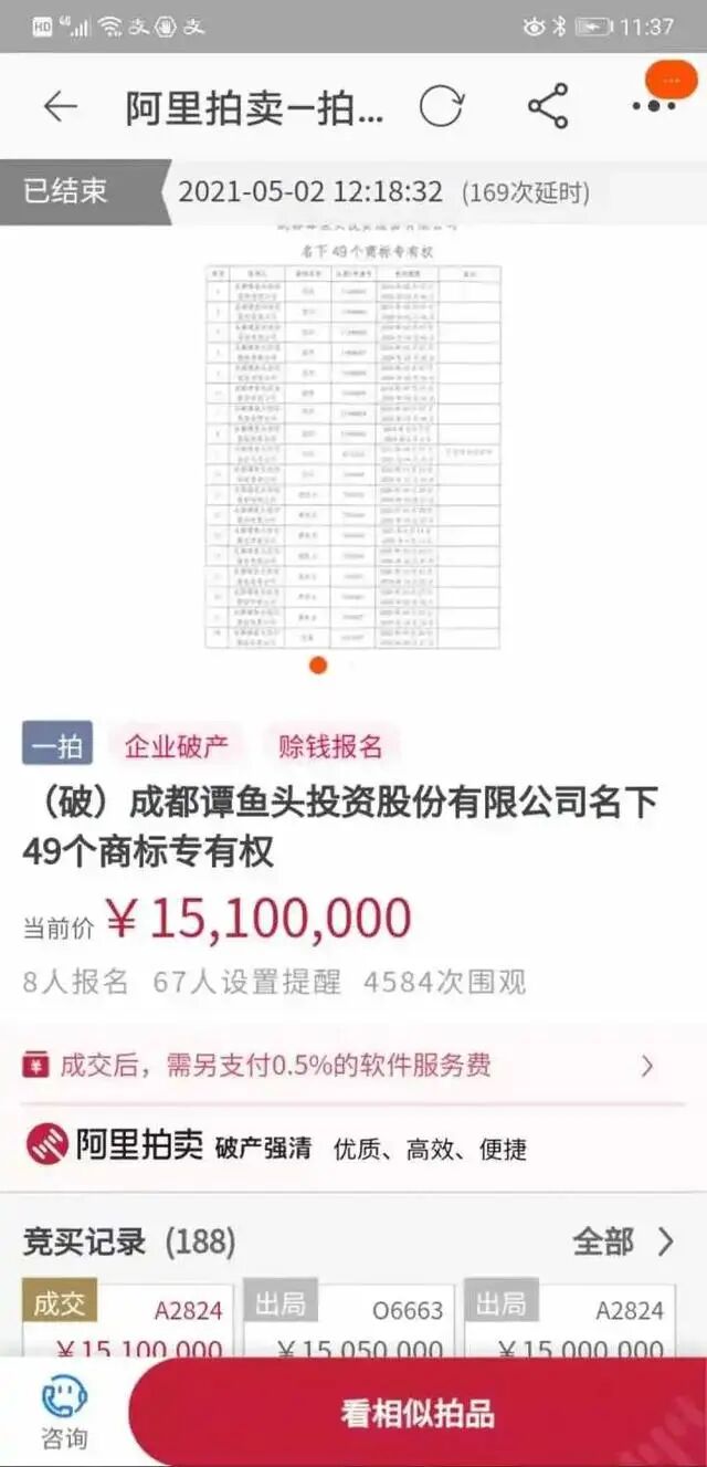 再次得到“谭鱼头”的消息,没想到是在这个人潮涌动的五一假期中——“谭鱼头”名下49个商标,以100万元起拍。竞争异常激烈,最后以1510万拍卖成交,溢价超15倍。