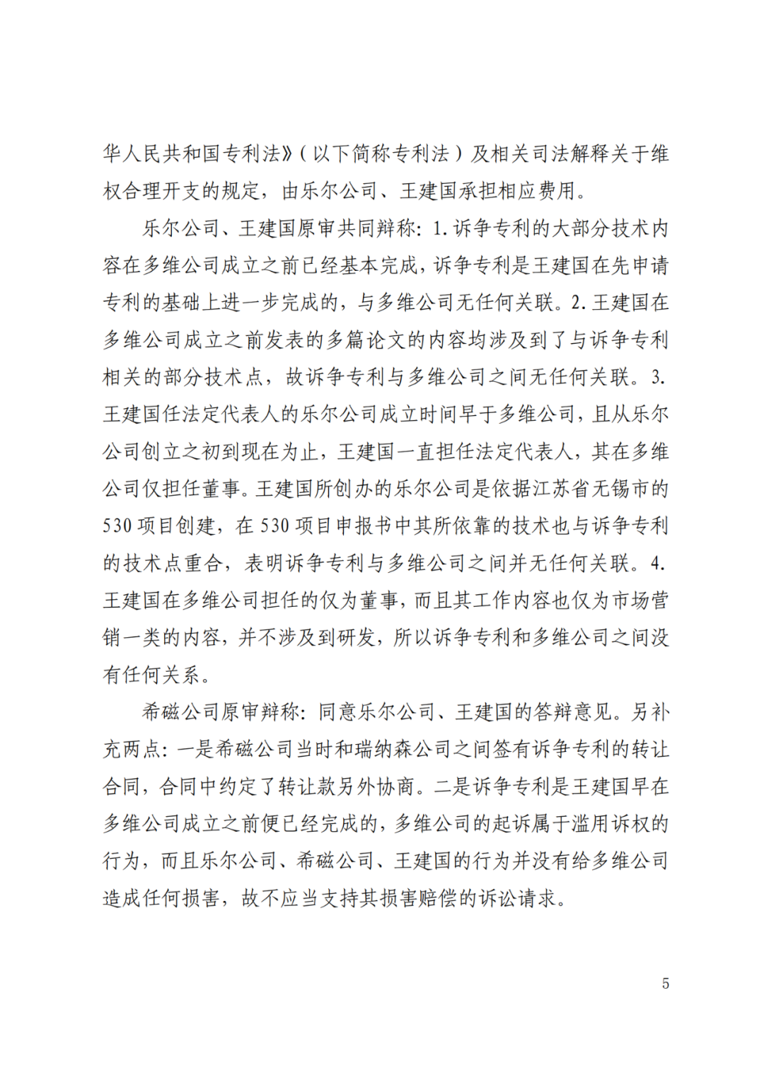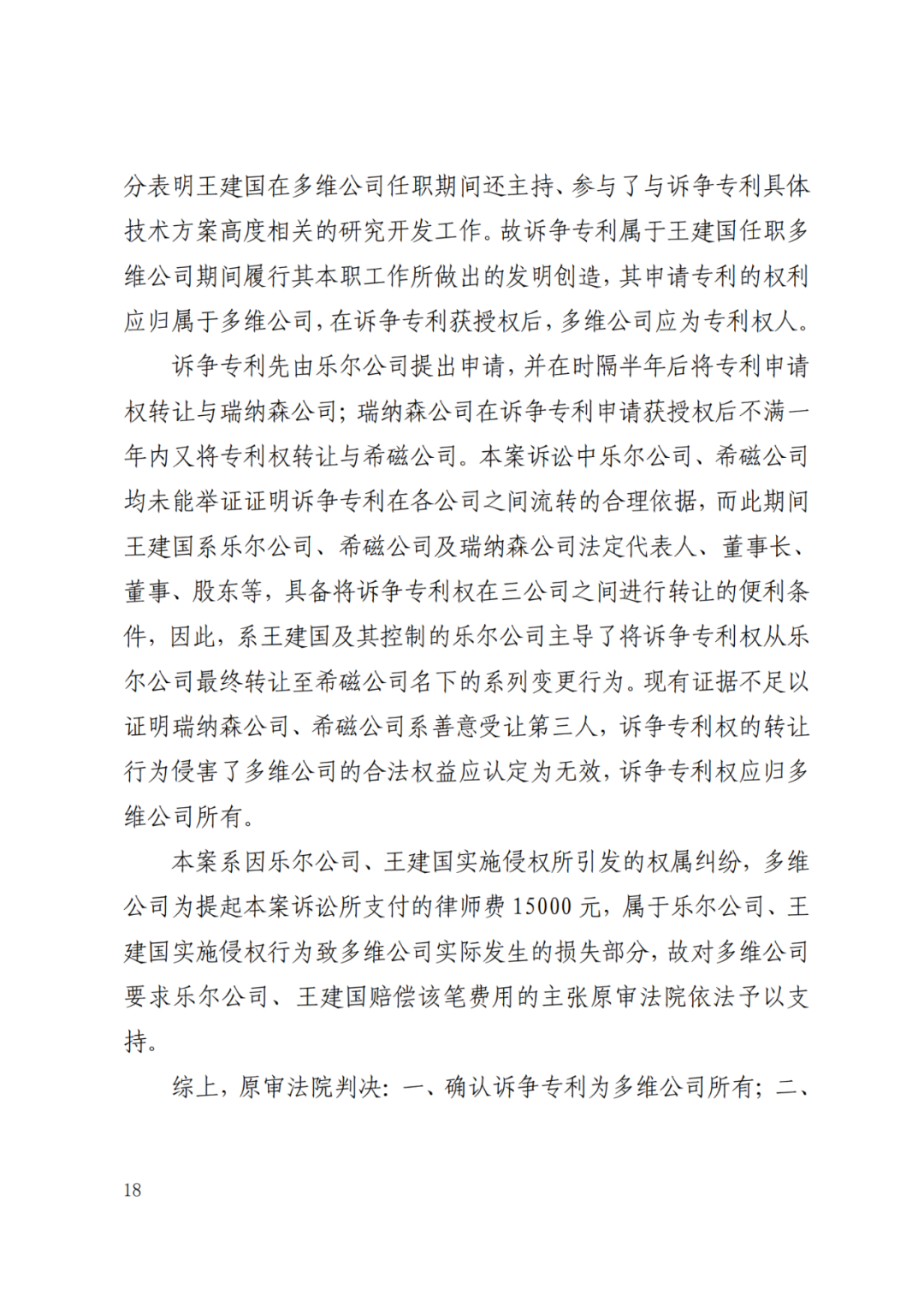 本次结案的六起案件,法院认为本系列的专利权权属纠纷,实质上是一审被告将原本应当属于多维公司的专利申请权和专利权,擅自申请专利并登记至自身名下,对多维公司的权利造成损害,符合民事侵权的基本特征,故判令由乐尔公司、王某承担本案律师费。