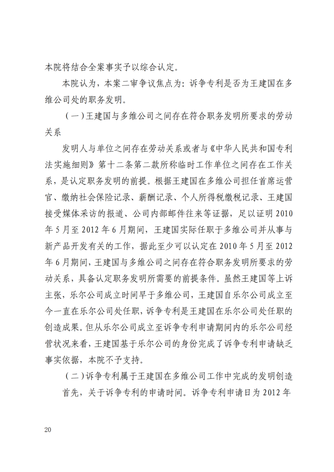 被告公司、被告人辩称:1.王某并不能直接地确认为多维公司的员工。王某自从2009年9月份便创立了乐尔公司,并且一直担任乐尔公司的法定代表人,而其在多维公司担任的仅仅是董事身份。故不能基于董事身份直接认定王某为多维公司的员工。2.即便认为王某是多维公司的员工,其所担任的本职工作是市场开拓相关的工作,并非研发工作。涉案专利的完成与王某在多维公司的本职工作无任何关系。3.诉争专利的完成没有利用多维公司的物质技术条件。