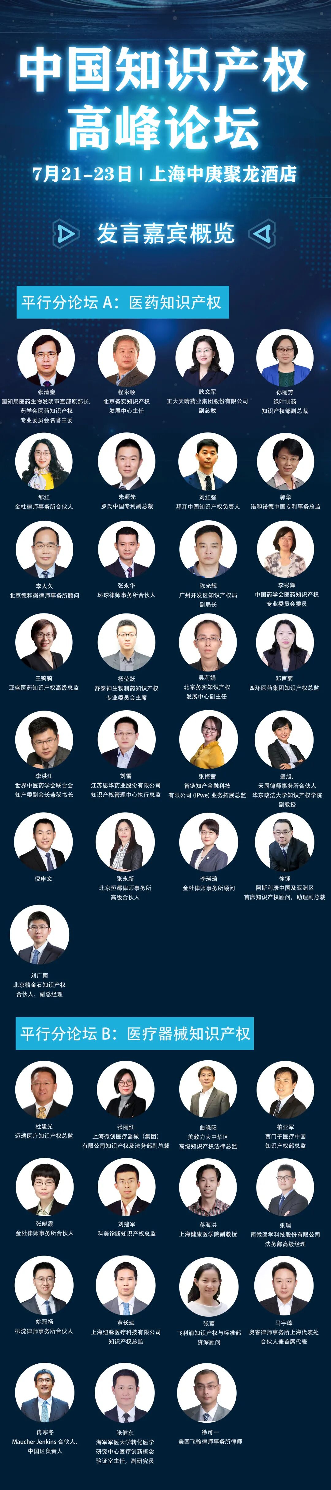本届高峰论坛将于2021年7月21-23日在上海中庚聚龙酒店召开,由主论坛、平行分论坛(医药知识 产权+医疗器械知识产权+通信知识产权+芯片知识产权)、展商活动、鸡尾酒会、圆桌晚 宴等环节组成。诚邀各行业关注知识产权创造、运用和保护的嘉宾参会,共同探讨国内外 知识产权保护热点话题,深化企业知识产权保护意识,提升企业知识产权管理水平,促进 行业创新发展,增强我国企业国际竞争力。