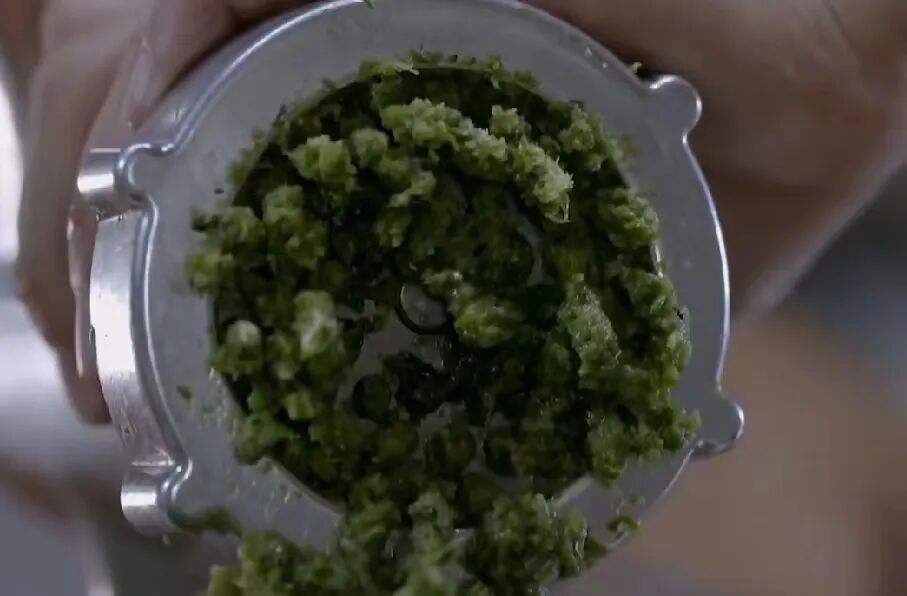 云南韭菜花的制作过程,被送进绞肉机的韭菜花,在搅碎时会散发出一种韭菜特有韭味。图片来自纪录片《舌尖上的中国》第二季。