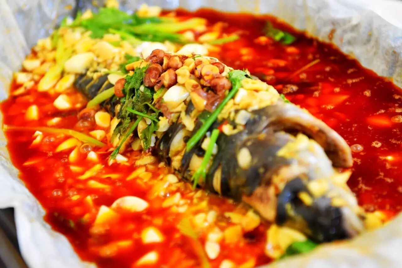 ★主厨推荐:我们选用1.2公斤左右的活鱼宰杀干净后,用腌料腌制好后进锅蒸成七分熟,然后用大蒜、汤料等组成调料包与鱼一同用纸包起来,在铁板上煎十分钟,就可以吃了。食客还可以继续加汤料和配菜做成火锅吃。这道菜结合传统烤鱼与韩国烧烤等工艺,是对传统菜品的传承和创新。