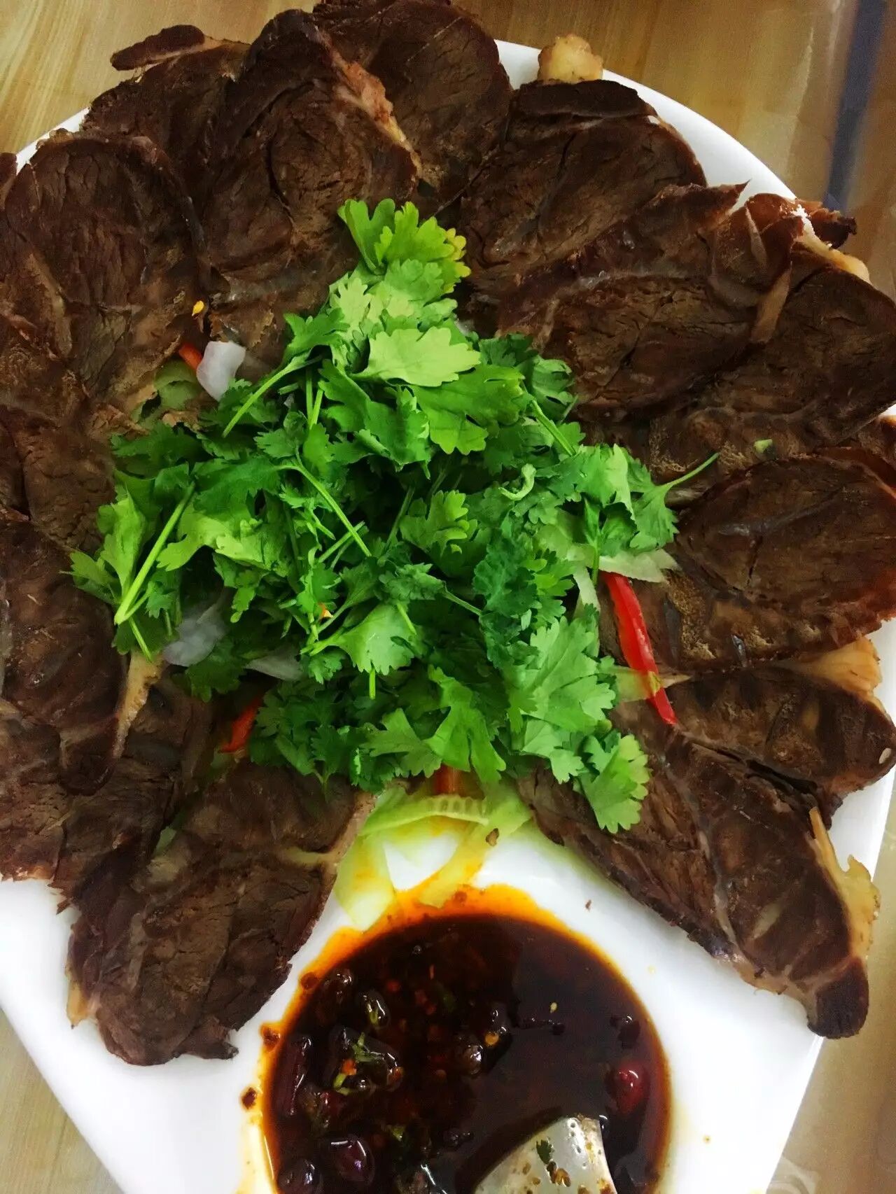 ☆品鉴团点评:肥牛不蘸酱料食用,肉质依然鲜美软嫩。蘸着店里特制酱料,也不会盖住牛肉的鲜美,反而烘托出了牛肉的香味。如果爱吃辣味,还可以在酱料中加入几粒尖椒碎,立刻就会突显出辛辣的感觉。