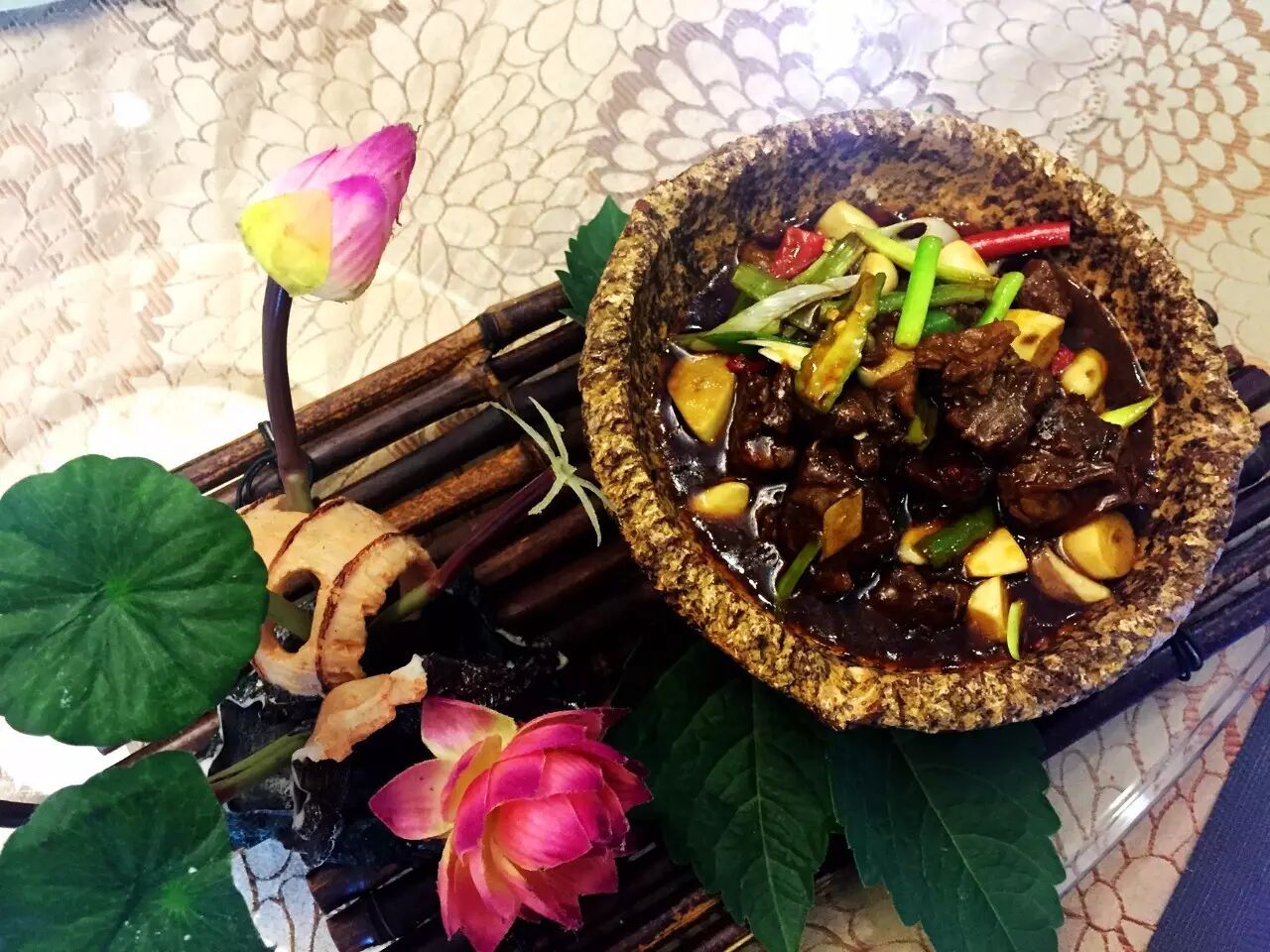 ★主厨推荐:荷花盛开,旁边的石头小池里是香味知足的牛腩,色泽鲜艳,这款造型精致的菜就是该店的特色擦腊八蒜烧牛腩。该菜有别于其他的牛腩的关键是腊八蒜。每次我们都会提前半个月将新鲜大蒜用醋腌制。制作菜品时,将腌制好的大蒜与牛腩一起红烧。