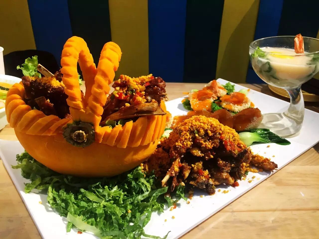 ★主厨推荐:与其他烧烤城的大盘羊排粗旷摆放相比,我们家的羊排摆盘精致,造型别致。我们用金瓜精心雕琢成了小竹篮,里面装着色泽鲜亮的羊排,旁边摆放着油炸出金黄色的大虾和嫩绿的小白菜。