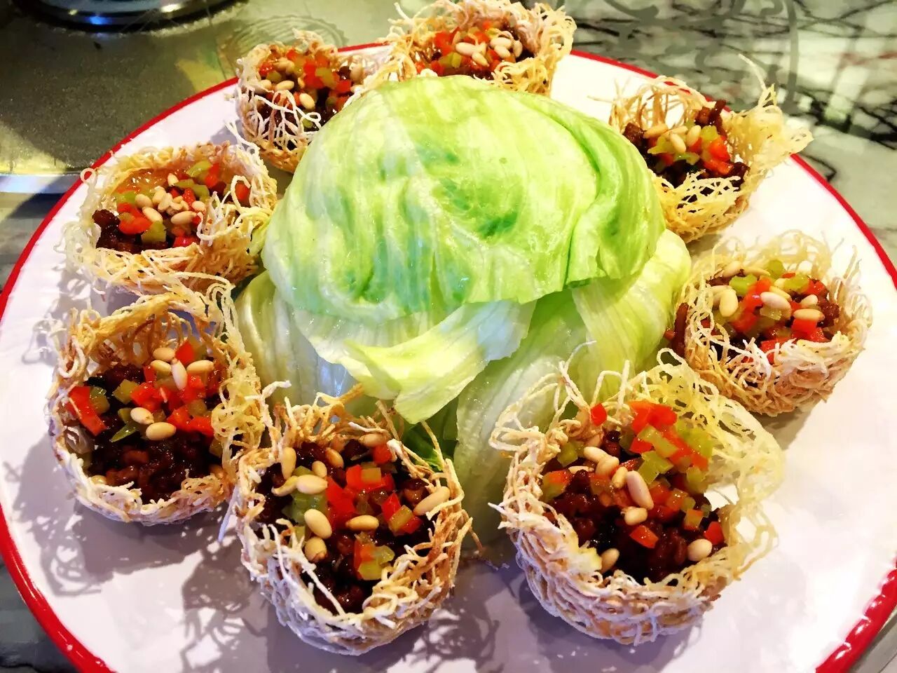 ★主厨推荐:烤鸭常见,但如何将百姓司空见惯的烤鸭做出花样,很考验一家烤鸭店大厨师的水平,全聚德烤鸭店做到了。全聚德烤鸭店推出的雀巢鸭宝就是他们的一道创新菜,将土豆丝切成比头发丝略粗的丝状,放进锅里油炸成金黄色,然后将其捏成鸟巢状,里面转满鸭碎肉,上面再配点蔬菜和松子,真如鸟巢,造型精致可人。吃时外面包裹一层西生菜,咬一口清爽的西生菜搭配入口酥脆的“鸟巢”,以及浓香醇厚的鸭肉,妙哉。