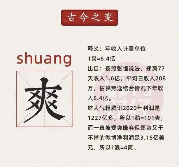 爽,这个单位来源于郑爽前夫爆料:郑爽日均收入208万,年收入劳逸结合6.4亿,所以1爽等于6.4亿元人民币。