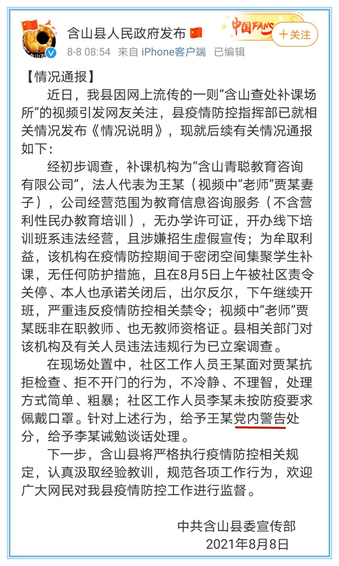 根据@含山县人民政府发布 8月6日通报我们也得知,王某的简单粗暴是有原因的:上午查处了一次,所谓的老师(该场所无办学许可证)贾某当场承诺关闭,结果下午还继续补课。这样一而再再而三给含山当地抗疫添乱,王某的心情可想而知,这种时候情绪有一些失控,虽说很不妥当,但也不应该过度苛责。