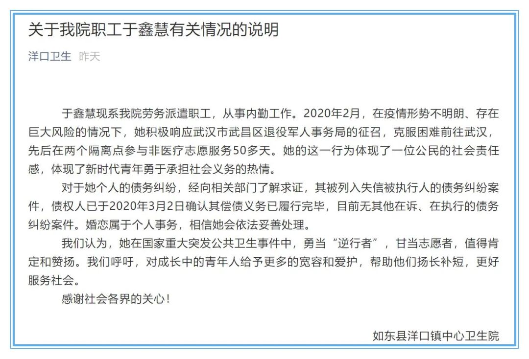 2020年10月,主动参加湖北抗疫并高调征婚的如东县洋口镇中心卫生院的劳务派遣职工于鑫慧,因婚恋问题处理不当全网“翻车”,遭全网抨击。这个负面影响可比含山“踹门查处补课”影响大多了。