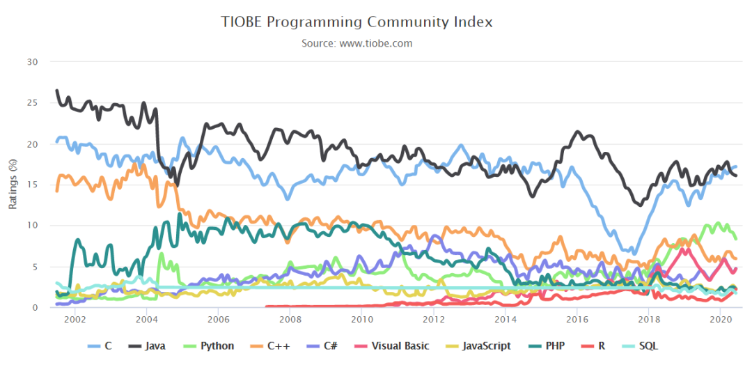 TOP 10 编程语言 TIOBE 指数走势(2002-2020)