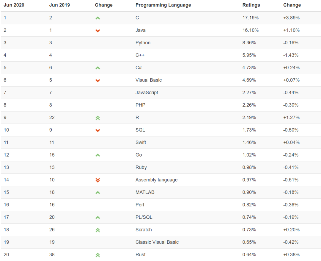 在上周新鲜出炉的 Stack Overflow 2020 开发者调查报告中,Rust 连续第五年夺下“最受欢迎的语言”宝座,此次进入 TIOBE 排行榜前 20 也毫不令人意外。接下来,就看它是否能保持住这个位置。