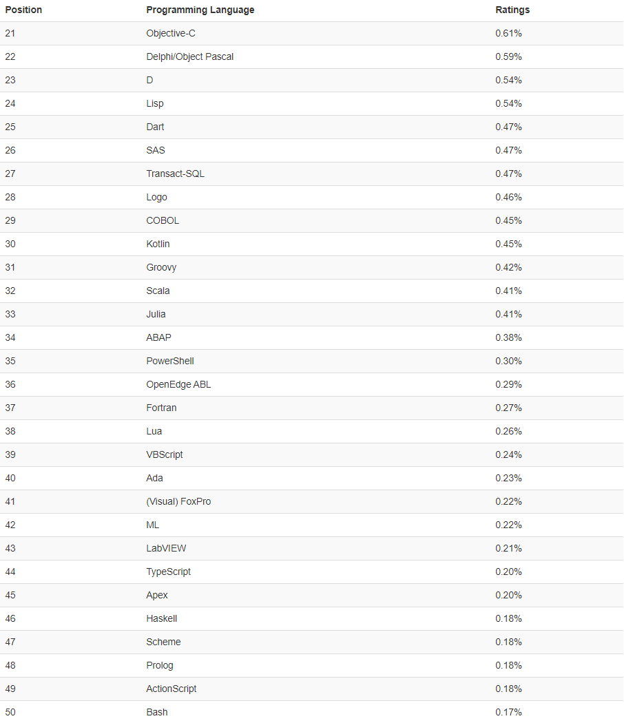 至于此前排名连月下掉,上月卡在第 20 位的 Objective-C ,在本次榜单中不见踪影。
